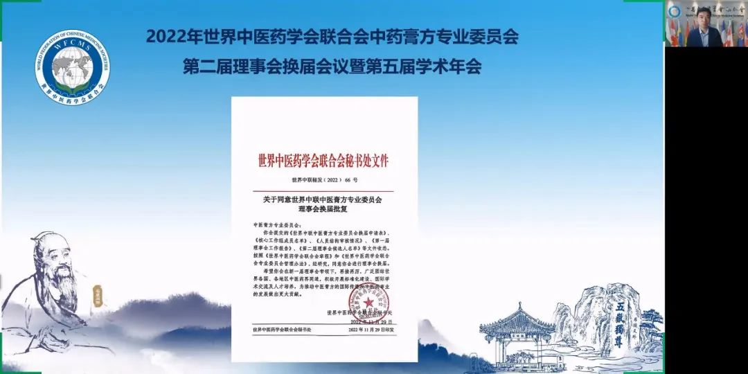 2022年12月4日上午,世界中醫(yī)藥學(xué)會(huì)聯(lián)合會(huì)(世界中聯(lián))中醫(yī)膏方專業(yè)委員會(huì)第二屆理事會(huì)換屆會(huì)議暨第五屆學(xué)術(shù)年會(huì)通過(guò)線上方式隆重召開(kāi)。世界中聯(lián)主席馬建中向大會(huì)發(fā)來(lái)視頻致辭,學(xué)術(shù)部主任焦云洞代表世界中聯(lián)參加大會(huì),全國(guó)政協(xié)委員、首都名中醫(yī)、享受國(guó)務(wù)院政府特殊津貼專家、世界中聯(lián)中醫(yī)膏方專業(yè)委員會(huì)會(huì)長(zhǎng)、北京康益德中西醫(yī)結(jié)合肺科醫(yī)院董事長(zhǎng)兼院長(zhǎng)董瑞和顧問(wèn)、副會(huì)長(zhǎng)、常務(wù)理事、理事及會(huì)員共335人參加了大會(huì)。其中來(lái)自匈牙利、葡萄牙、澳大利亞、俄羅斯、瑞典、波蘭、英國(guó)、美國(guó)、芬蘭、韓國(guó)、中國(guó)香港、中國(guó)澳門、中國(guó)臺(tái)灣等地的外籍專家學(xué)者65人。會(huì)議由第一屆理事會(huì)秘書(shū)長(zhǎng)秦洪義教授主持。