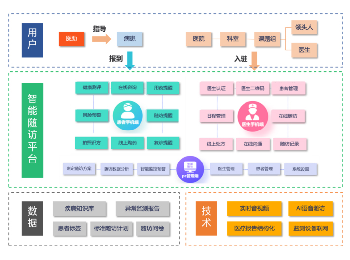 天坦智能開(kāi)發(fā)的慢病管理運(yùn)營(yíng)服務(wù)是一套完整的心血管隨訪(fǎng)標(biāo)準(zhǔn)體系,配合適用性極強(qiáng)的醫(yī)生端可配置界面,滿(mǎn)足絕大多數(shù)開(kāi)展冠心病介入的醫(yī)療機(jī)構(gòu)需求,同時(shí),基于專(zhuān)家隨訪(fǎng)團(tuán)隊(duì)之間的協(xié)作,建立上下聯(lián)動(dòng)的醫(yī)生互動(dòng)機(jī)制,為隨訪(fǎng)的患者提供專(zhuān)業(yè)的管理方案。匹配有人工智能為核心的隨訪(fǎng)管理機(jī)制,可自動(dòng)化發(fā)送患者所需要信息,量表等隨訪(fǎng)內(nèi)容,具備機(jī)器學(xué)習(xí)功能,針對(duì)不同醫(yī)院形成不同模式的隨訪(fǎng)系統(tǒng)配置,匹配個(gè)性化的醫(yī)院隨訪(fǎng)體系,最終以患者交流平臺(tái),建立以患者需求為中心的線(xiàn)上服務(wù)體系,包括專(zhuān)家線(xiàn)上咨詢(xún)、藥品直送、可穿戴式設(shè)備居家監(jiān)護(hù)、護(hù)理居家康復(fù)及圍繞手術(shù)全周期的保險(xiǎn)支付產(chǎn)品。形成以醫(yī)學(xué)+智能+個(gè)性化+支付功能為一體的新一代的慢病管理平臺(tái)。
