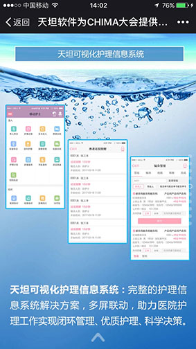天坦軟件在本次展會展出天坦可視化護(hù)理信息系統(tǒng)、天坦移動醫(yī)生助手、天坦移動查房筆等自主主打產(chǎn)品。天坦工作人員在展前做了精心準(zhǔn)備,在展會上為大家進(jìn)行產(chǎn)品講解和演示,可以生動還原產(chǎn)品的使用情景,請大家拭目以待。