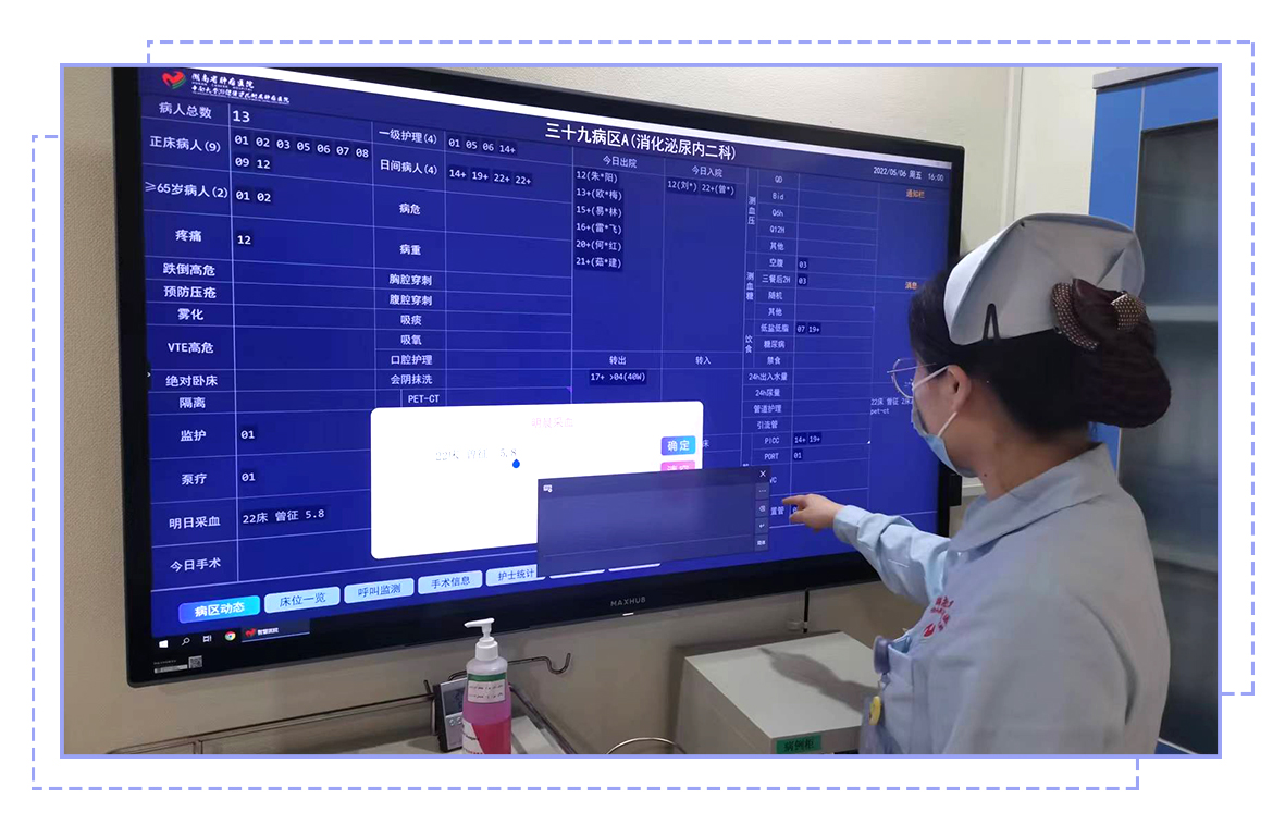智能交互大屏作為整個(gè)病區(qū)的中心,展示病區(qū)所有患者信息的護(hù)理信息,代替了傳統(tǒng)的白板記錄,并且可以查看病區(qū)患者簡卡及患者動態(tài),對病區(qū)內(nèi)需手術(shù)患者信息展示、護(hù)士交接班信息展示,使管理人員可以做到心中有數(shù),合理分配工作,還可對病區(qū)數(shù)據(jù)統(tǒng)計(jì),如患者呼叫統(tǒng)計(jì)、護(hù)士信息統(tǒng)計(jì)、值班動態(tài)統(tǒng)計(jì),從而建立一個(gè)有序的醫(yī)療環(huán)境。